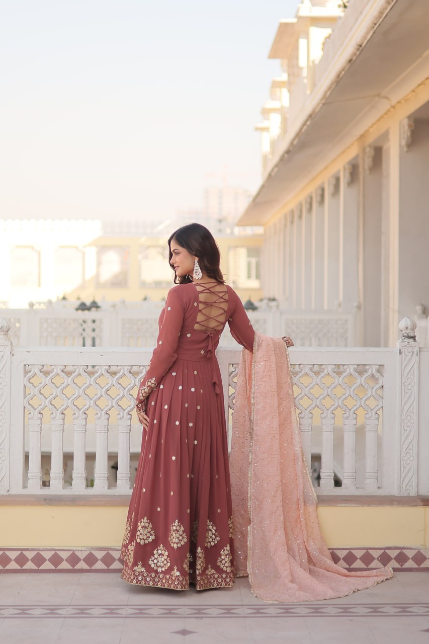 Designer Gown – Crafted with luxurious Zari Thread and Sequins Embroidery, this gown is designed for the modern woman who deserves nothing but the finest quality.