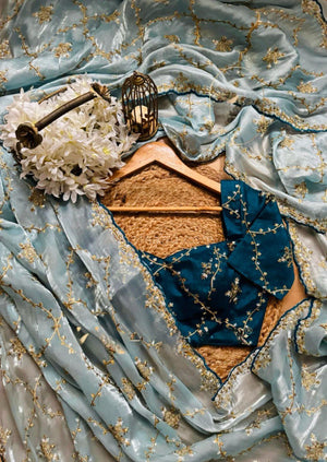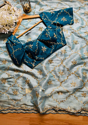 This beautiful designer saree is made from premium Zimmy Chu fabric and features intricate thread and sequin work. The blouse is crafted from luxurious Mono Bengali silk, with thread and sequin detailing on both the front and back, making it the perfect choice for a sophisticated look at any occasion.