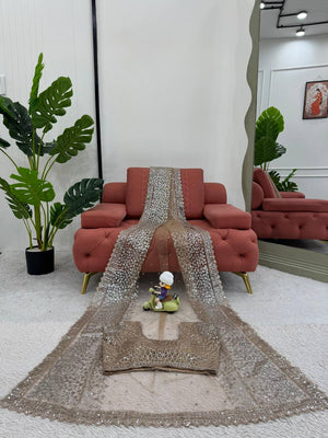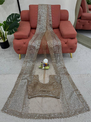 This elegant designer saree is made from Soft Net fabric, featuring delicate and detailed sequence work. The blouse, also crafted from Soft Net fabric with sequence work, complements the saree perfectly, offering a graceful and stylish look.
