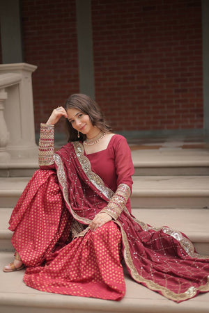 Explore this elegant and stylish Sharara Suit set, perfect for any occasion with its stunning faux georgette kurti, luxurious sharara, and beautifully embroidered dupatta.
