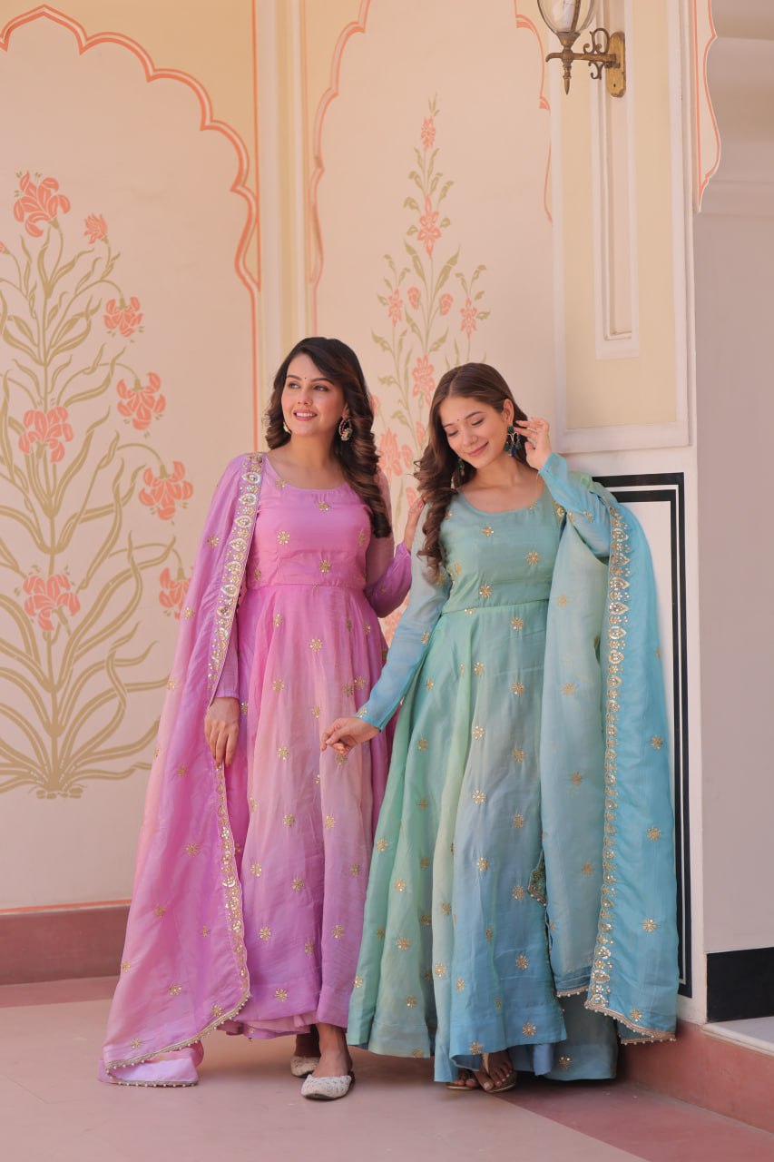 Step into the spotlight with this fashion-forward designer gown, crafted from luxurious Pedding Gold Organza and adorned with Sequins-Multi and Zari Embroidered Work. Designed to flatter all body types, this gown blends the grace of Indian ethnic wear with the glam of modern styling — the ultimate showstopper! 💝