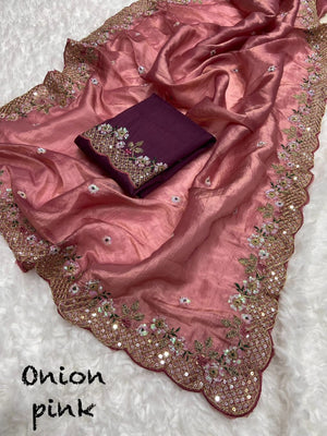 ✨ Saree: Crafted from Heavy Premium Soft Gold Crush Silk, featuring stunning C-Pallu Embroidery with intricate Sequins Work, Zari Threads, and Cording Details. The saree is beautifully finished with a Cut Work Border for an extra touch of elegance.