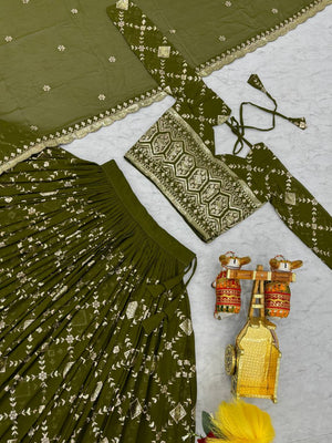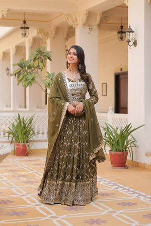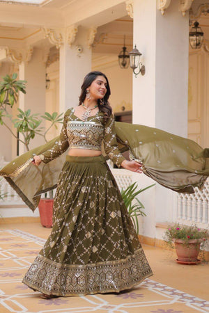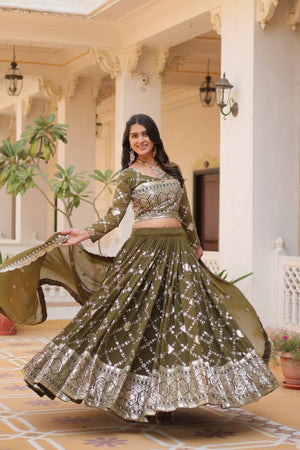 This stunning Festival Lehenga Choli set features beautiful embroidery sequence work on Heavy Fox Georgette fabric. The lehenga comes with a full flair of 3.50 meters, and the dupatta is crafted with the same elegant sequence embroidery. Perfect for any festival or celebration, this set combines traditional craftsmanship with modern flair. Available in Wine and Rama colors.
