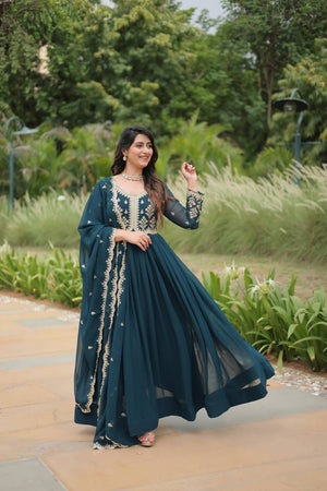 Introducing the Faux Blooming Gown with Sequins-Multi Embroidered Work. Designed to flatter all body types, this gown combines the best of western and Indian wear into one stunning ensemble, perfect for any grand occasion.