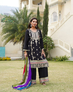 This set combines elegance with intricate detailing, making it an ideal choice for festive events and special occasions. The multi-color dupatta adds a unique and vibrant touch!