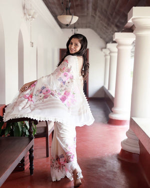This exquisite designer saree is made from premium Faux Georgette fabric, featuring a vibrant digital print paired with elegant fancy lace detailing. The blouse, crafted from Mono Bengali silk, is kept plain, offering a simple yet stylish contrast to the intricacy of the saree. This combination is perfect for any occasion where you want to stand out in elegance.