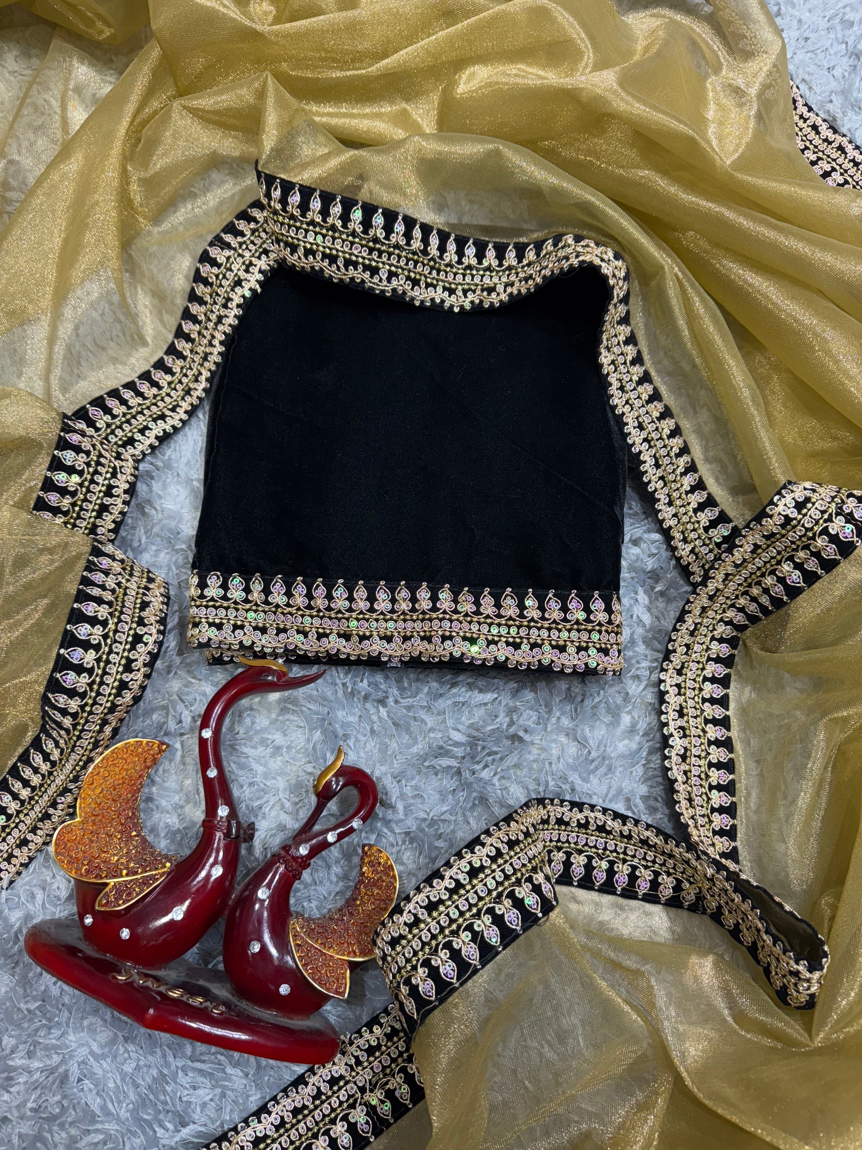 Blouse: Original 9000 Velvet Fabric with sequins work border, designed to perfectly complement the saree