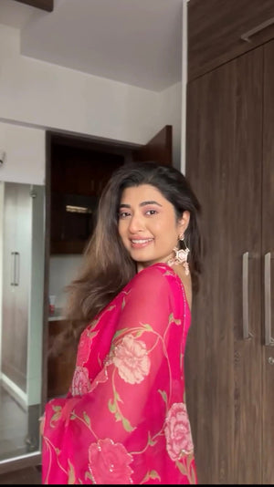 Exuding grace and sophistication, this floral-printed organza saree is a masterpiece of craftsmanship. Each delicate petal in the design tells a story of timeless charm, making it the perfect choice for weddings, festive gatherings, and special occasions where elegance is key.
