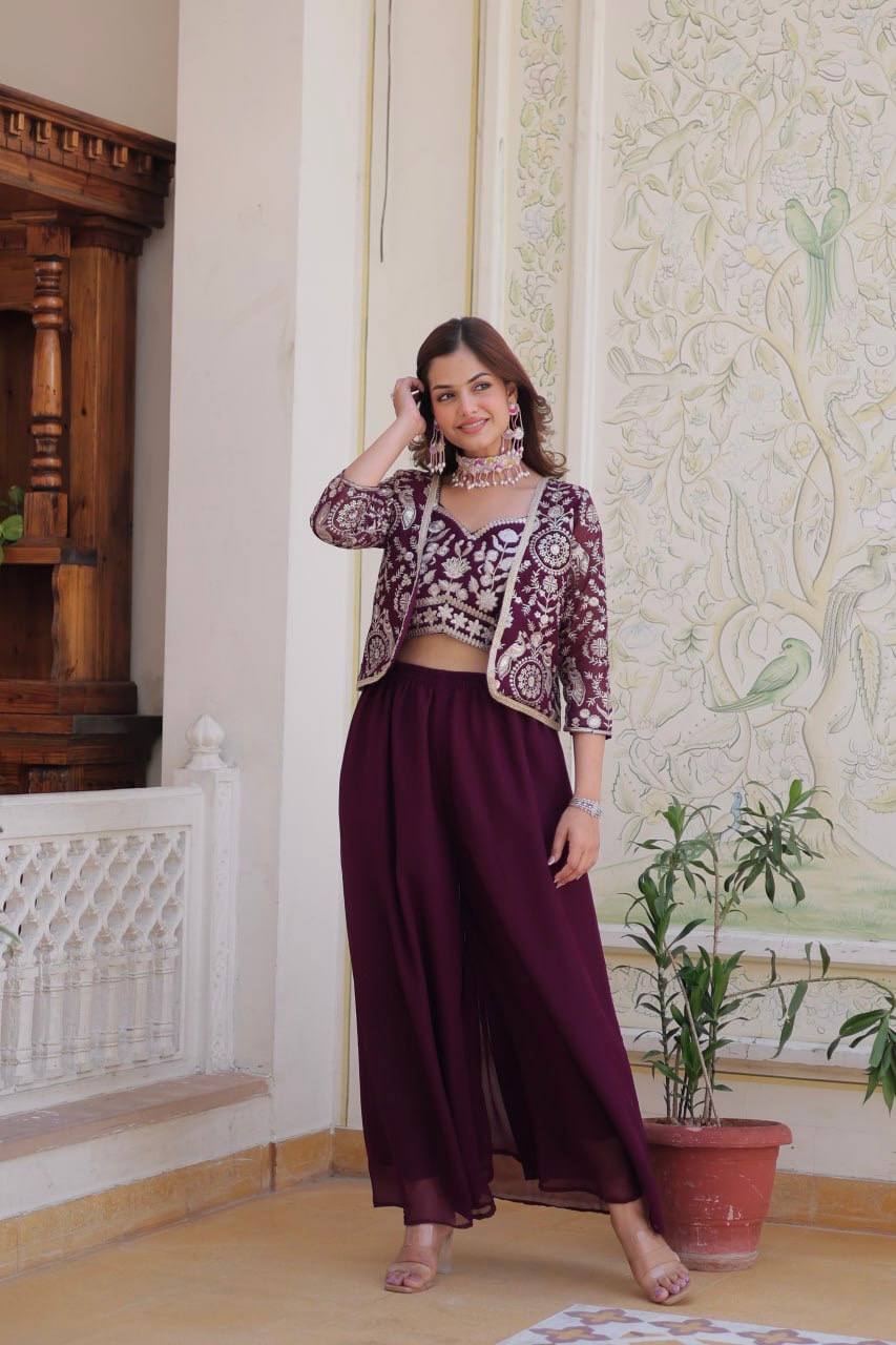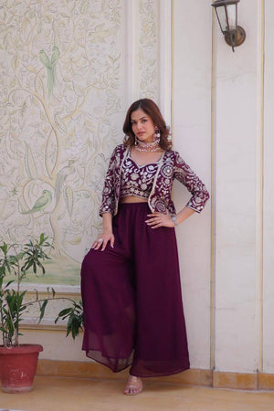 This Festival Koti & Palazzo Set is designed to bring elegance and comfort to your festive look. The stunning heavy embroidery and lace work on the Koti, combined with the chic sequence work on the choli, make this outfit a perfect choice for celebrations. The palazzo offers a stylish and comfortable fit, with a luxurious feel, ideal for any special occasion.