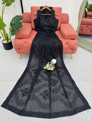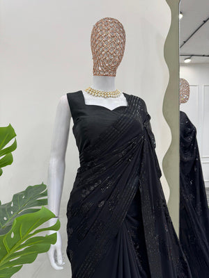 This elegant designer saree is made from premium Faux Georgette fabric, featuring intricate thread and sequin work. The blouse, crafted from Mono Bengali silk, complements the saree with matching thread and sequin detailing, offering a stylish and sophisticated look.