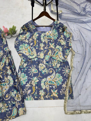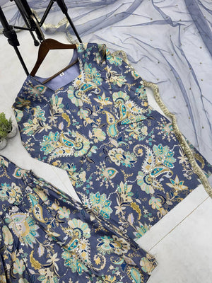 This luxurious sharara suit set is crafted in premium Chinon fabric with stunning print and sequin embroidery work, designed to deliver elegance and comfort. The full-flare sharara, stylish top, and embellished dupatta create a perfect look for festive, party, or wedding wear.