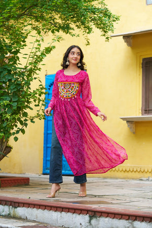Fabric & Work: Beautiful Bandhej Print on soft Faux Georgette, adorned with Kutchi Patch-work for an ethnic festive look