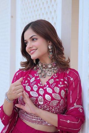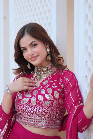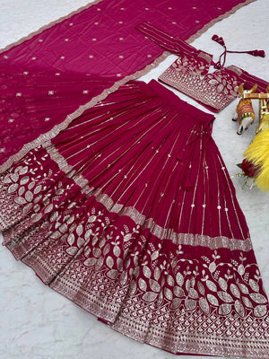 This Wedding Lehenga Choli Set offers an elegant and stunning look with its intricate embroidery and sequence work. The lehenga’s wide flair and rich fabric make it a perfect choice for weddings and other grand occasions. Available in two beautiful colors, Rani and Begani, this set ensures a luxurious and sophisticated presence.