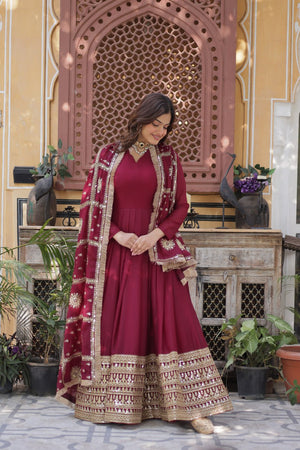 - Fabric: The matching dupatta is crafted from the same Star Georgette fabric, adorned with sequins embroidery to complement the gown’s beauty. A designer lace border enhances the traditional charm.