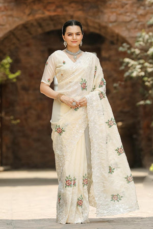 🌸 Beautiful cross-stitch floral motifs throughout the saree