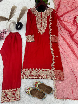 This refined version ensures the product details are clear, highlighting the luxurious fabrics, intricate embroidery, and the convenience of a fully stitched, ready-to-wear set.