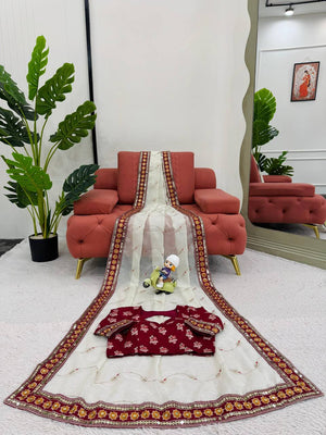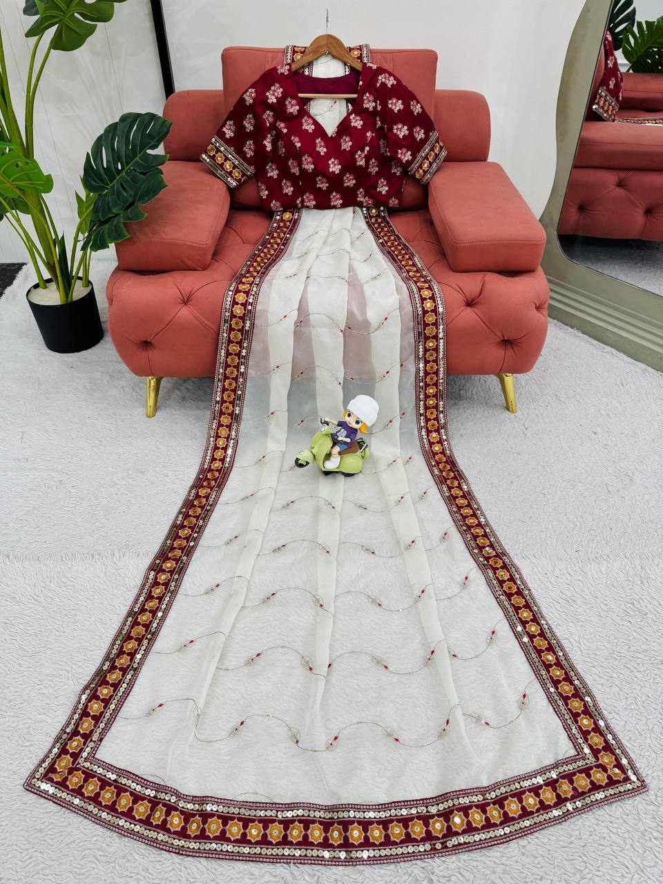 This exquisite designer saree is made from Heavy Tibby Silk fabric, adorned with intricate thread and 9MM sequence work. The blouse, crafted from Mono Benglori Silk fabric, also features beautiful thread and sequence work, making this outfit a perfect blend of luxury and elegance.