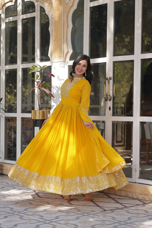 β¨ Get ready to shine in these exquisite ensembles, crafted from Faux Blooming Georgette and adorned with sequins embroidery. Elevate your wardrobe with these glamorous pieces and make a statement wherever you go. β¨