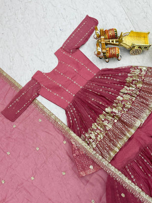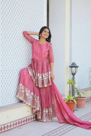 This Festival Top & Sharara Set is perfect for special occasions and celebrations. Featuring intricate 3mm sequence embroidery on a luxurious pure simmar fabric, this set promises a blend of elegance and comfort. The matching dupatta adds an extra layer of grace to complete the festive look. Available in a range of sizes with a rich flair and delicate finishing, this outfit is sure to be a standout at any event.