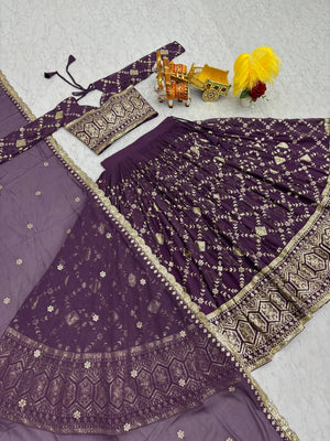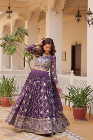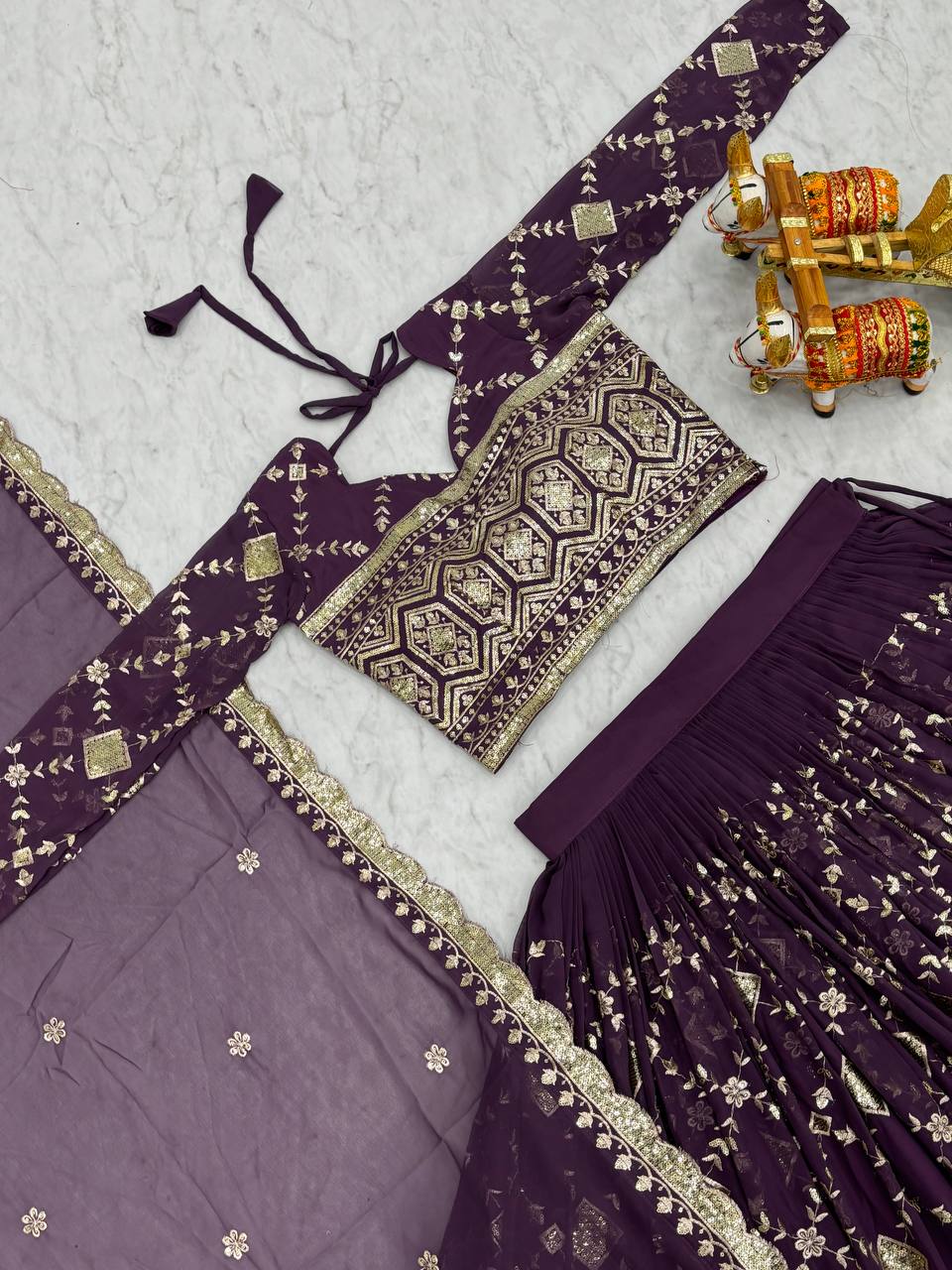 This stunning Festival Lehenga Choli set features beautiful embroidery sequence work on Heavy Fox Georgette fabric. The lehenga comes with a full flair of 3.50 meters, and the dupatta is crafted with the same elegant sequence embroidery. Perfect for any festival or celebration, this set combines traditional craftsmanship with modern flair. Available in Wine and Rama colors.