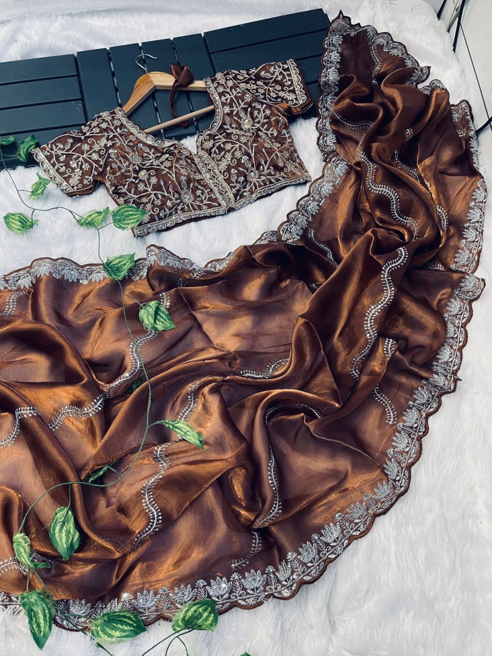 Blouse: Pure Soft Zimmy Choo Silk with full sequins work, designed to complement the saree’s elegance